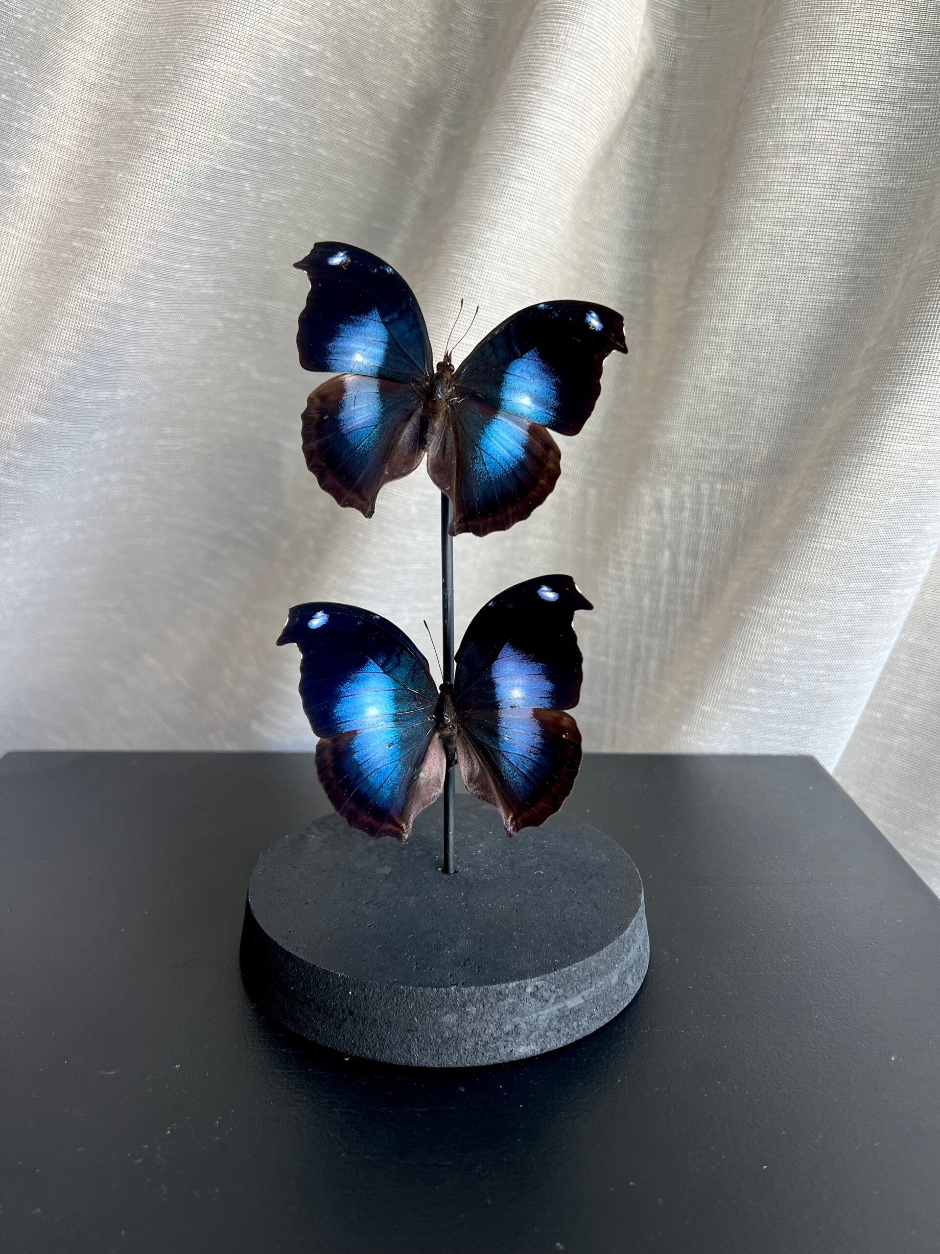 Vlinderstolp met 2 prachtige Napeocles Jucunda's. Deze soort komt uit Peru. Ze hebben een bijzonder vleugel vorm en een gave zwart met blauwe opdruk. Het blauwe gedeelte glanst prachtig mee in het daglicht.